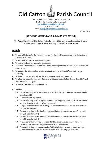 Old Catton Parish Council has a number of responsibilities within the Parish. These include looking after the recreation grounds in Church Street and Lavaré Park, including the two pavilions, football and cricket pitches, tennis courts, bowling-green and children's play areas. The Council also looks after most of the street lighting, notice boards, bus shelters, village sign, church-yard, war memorial and cemetery.